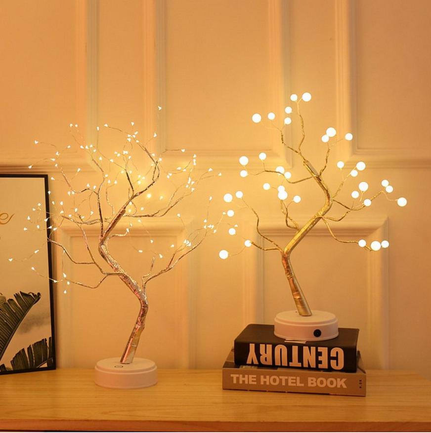 Оригинально-неожиданный настольный светильник в виде дерева со светящимися элементами. На странице товара есть несколько различных вариантов как по форме исполнения, так цвету и количеству светодиодов. Ствол и ветви покрыты серебристой лентой золотого или серебряного цвета. Питание от 3 батареек АА или USB 5В. Высота около 50см.