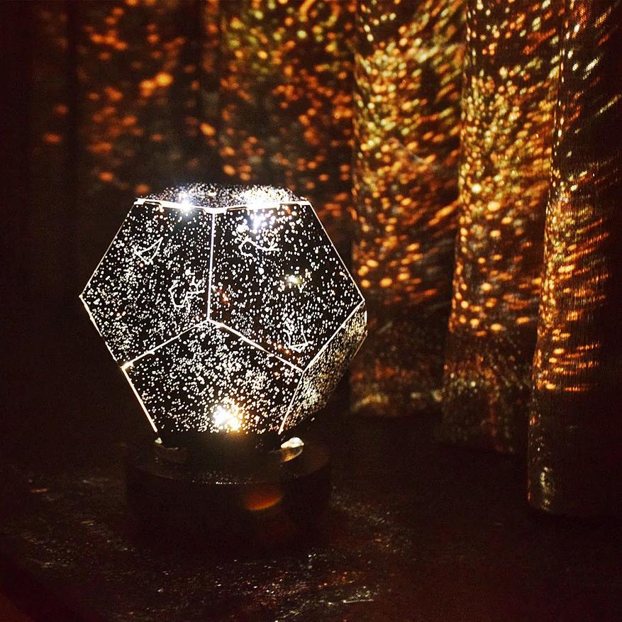 Ночник, который можно установить на стол или тумбочку, создающий иллюзию звездного неба на потолке и стенах. Площадь световой проекции около 12 кв.м. Есть модель с функцией вращения вокруг оси и пультом дистанционного управления. Размер светильника 22x13см, три варианта цветовой подсветки. Питание обеспечивается от обычной USB зарядки или встроенного аккумулятора. Отображаются «звезды» и «созвездия».