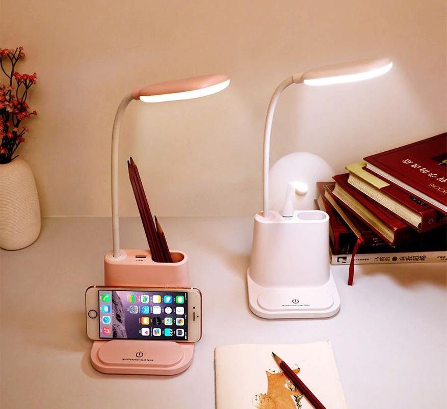 Интересный вариант настольной аккумуляторной лампы с «кармашком» для канцелярских предметов, USB-портом и небольшим съемным вентилятором. Емкость аккумулятора 1200мАч, удобно использовать там, где нет розетки. Цветовая температура (которую можно переключать) — теплый (2800-3200K) или холодный белый (6500-8500K). Порт для вентилятора можно использовать и для зарядки гаджетов.