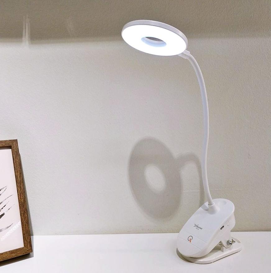 Компактная кольцевая лампа, которую можно установить не только на столе, но и, благодаря конструкции в виде прищепки, закрепить на торце вертикальной или горизонтальной поверхности, например, за край книжной полки. Лампа имеет встроенный аккумулятор на 1200мАч и работает на одном заряде от 3 до 5 часов, в зависимости от выбранного режима. Мощность 2 Вт, цветовая температура 6000-7500К. Стойка гибкая, можно установить произвольный угол наклона и удобное положение светового элемента.