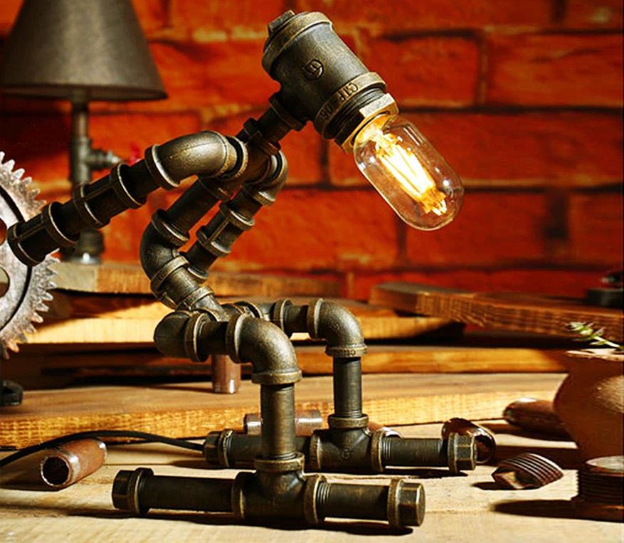Целая серия забавных и необычных светильников из водопроводных труб и сантехнических фитингов разной формы и размеров. Креативно, не то слово! :) Конструкция светильников собрана таким образом, что в соединенном виде все элементы образуют стилизованные фигурки роботов, сидящих или в движении. В качестве «головы» светильника, используется «ретро лампочка Эдисона». Высота фигурок около 40см. Выглядят необычным и эффективным украшением стола.