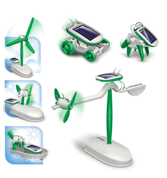 Этот интересный робот-конструктор работает на солнечной энергии. Просто вставьте элемент питания, и робот оживет на ваших глазах. Его особенность в том, что конструктор имеет 6 вариантов сборки. Это очень практично, купив один конструктор вы получите сразу 6 интересных роботов-игрушек: робота, самолет, вертолет, самокат, катамаран и ветряк. Детали изготовлены из гипоаллергенного пластика, их легко собирать в соответствии с инструкцией. Это очень даже приличный конструктор на солнечной батарее за небольшие деньги.