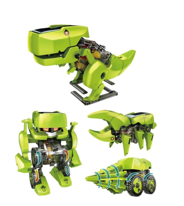 Отличный робот-конструктор на солнечной батарее, из которого можно собрать 4 работоспособных модели: динозавра, насекомое, робота и бурильную машину. Детали выполнены из хорошего пластика с ярко зеленой окраской. Прослужат не один год. Процесс сборки очень увлекательный, если следовать инструкции, то он не займет много времени. Внутри каждой модели устанавливается небольшой моторчик с шестерёнками, который и приводит её в движение. Все модели работают от солнечной энергии, поэтому тратиться на батарейки не придется.