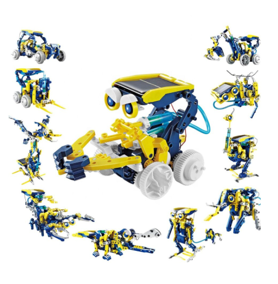 И напоследок, еще один интересный набор, который имеет 11 интересных вариантов сборки. Это может быть робот-слон, робот-собака, робот-багги, робот-экскаватор и другое. Все детали выполнены из качественного пластика с яркой окраской. Они легко соединяются и не требуют использования специальных инструментов. В общей сложности в комплекте 190 деталей. Если пользоваться инструкцией, то сборка не займет много времени. После, можно сразу выходить на улицу и наблюдать, как робот-игрушка движется, работая от солнечного света.