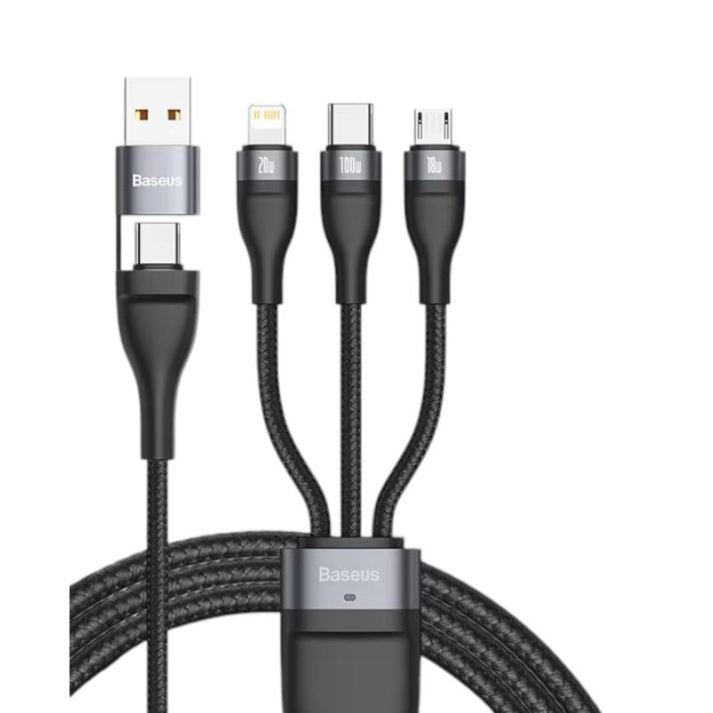 Кабель Baseus 3-в-1 подходит тем, кто хочет упростить процесс зарядки и избавиться от множества проводов. Например, для семей, где используются разные устройства — от iPhone до смартфонов на Android, а также гаджетов с Micro-USB, например, портативных колонок или старых моделей телефонов, гарнитуры. Светодиодный индикатор позволяет следить за процессом зарядки, а поддержка мощностей до 100 Вт (PD) обеспечивает быструю зарядку даже для ноутбуков. Длина 1,2 метра делает его универсальным: удобно использовать дома, в машине или на работе. Одним словом, кабель 3 в 1 для тех, кто любит порядок.