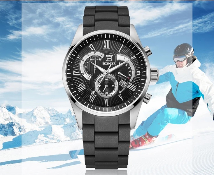 Неплохие кварцевые часы в корпусе из нержавеющей стали, с антикоррозионным покрытием. Циферблат представлен в двух цветовых решениях: черный и белый цвет. На мой взгляд, наиболее привлекательным выглядит черный циферблат, придающий часам более презентабельный вид. Помимо стандартного хронографа, часы показывают текущую дату и день недели. Браслет стальной, покрытый силиконом. В отличие от предыдущей модели, здесь используется сапфировое стекло, стойкое к царапинам. Также часы имеют более высокий класс защиты 5 АТМ, однако безбоязненно плавать в них, я бы не рекомендовал.