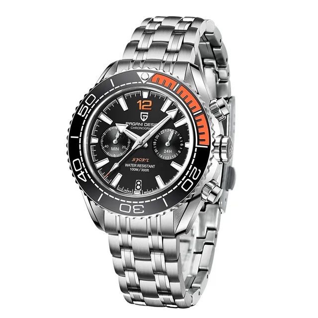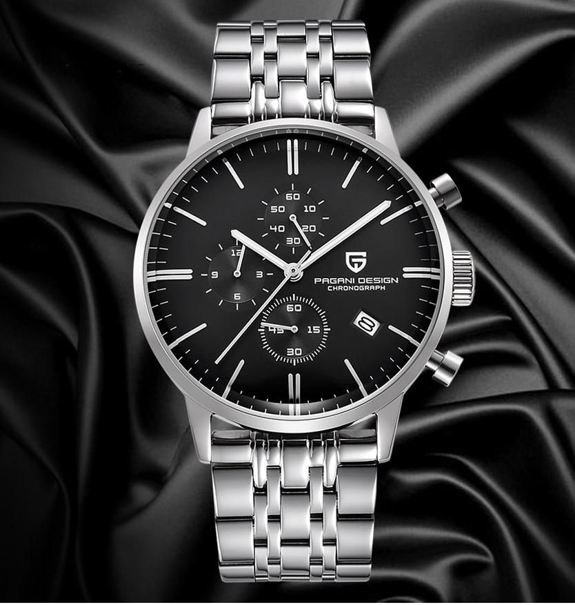 Мужские наручные часы от китайского часового бренда Pagani Design. В их основе лежит японский гибридный кварцевый механизм VK67. Часы выполнены в строгом стальном корпусе диаметром 46.5 мм. На циферблате расположены три дополнительных счетчика, а также окошко с датой. Сам циферблат прикрыт закаленным минеральным стеклом Hardlex, разработанный компанией Seiko Watch Corporation. Часы имеют класс водонепроницаемости 3 АТМ (30 метров). Они спокойно выдержат сильный дождь и мытье рук. В первоначальном варианте часы имеют стальной браслет, однако можно подобрать кожаный ремешок, в черном или коричневом цвете.