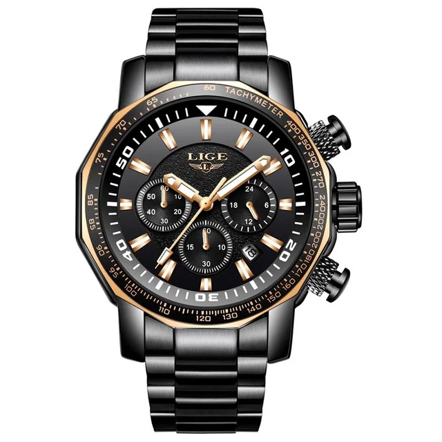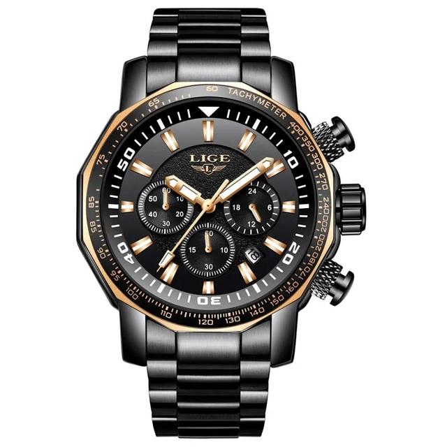 Бюджетная модель от китайского бренда LIGE. Несмотря на свою невысокую цену, выглядят они довольно неплохо. На корпусе из нержавеющей стали расположены две кнопки и заводная головка. Его диаметр составляет 48 мм, а толщина 14 мм. Циферблат выполнен в черном цвете, хотя есть варианты более светлых тонов. Хронограф стандартный, позволяющий измерять секунды, минуты, и часы. Из ремешков и браслетов, можно выбрать только один вариант — нержавеющая сталь. Класс защиты от влаги невысокий. Производитель заявляет до 3 АТМ. Часы приходят в элегантной фирменной коробке с логотипом бренда.