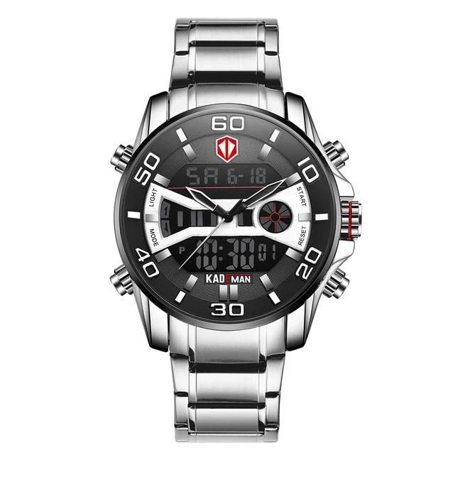 Завершают подборку роскошные часы от люксового бренда KADEMAN. Точный кварцевый механизм заключен в стальной корпус часов. С двух сторон на нем расположены по две функциональные кнопки. Помимо аналоговых стрелок, на циферблате присутствует небольшой монохромный дисплей, на котором в цифровом виде выводится текущее время, а также точная дата. Модель представлена в нескольких цветовых решениях. Часы имеют водонепроницаемость до 3 бар (30 метров), что позволяет выдерживать часам сильный дождь и кратковременное погружение в воду.