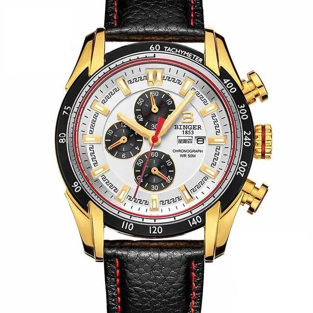 Кварцевые часы с хронографом, совмещающие в себе деловой и спортивный стиль. Минеральное стекло прикрывает белый циферблат, на котором расположено три дополнительных счетчика. Индексы покрыты тонким слоем люминофора. Дата выводится с указанием дня недели и числом. Корпус стальной, окрашенный в позолоченный цвет. Габаритные размеры: 44*11 мм. Ремешок изготовлен из качественной искусственной кожи, с классической застежкой. По заявлению производителя, часы имеют класс водозащиты 5 АТМ (50 метров).