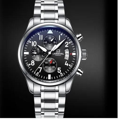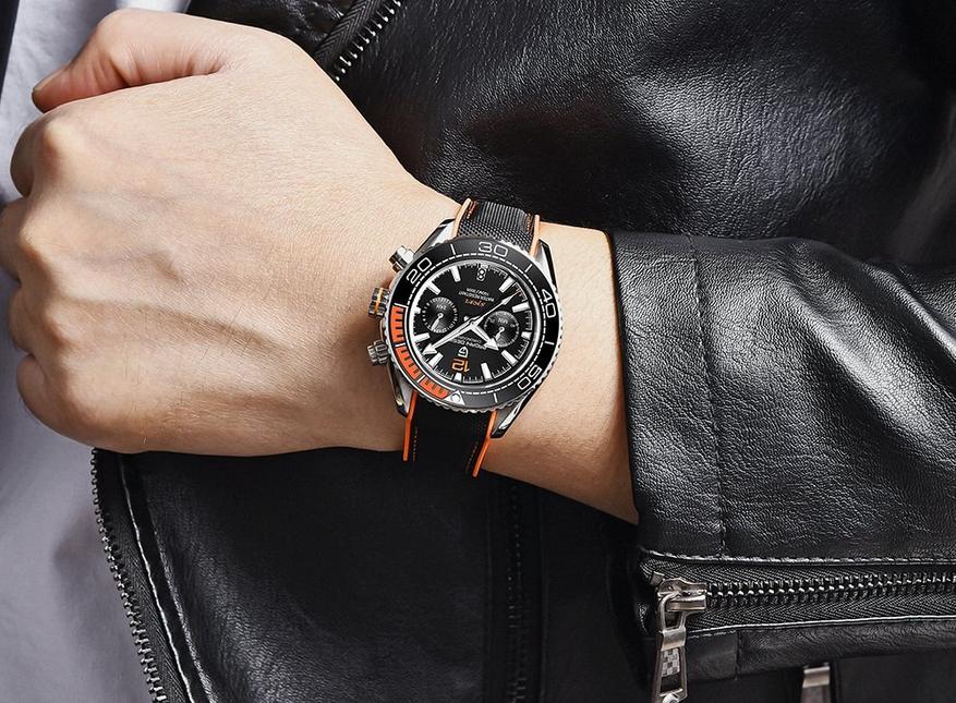 Еще одни часы от китайского бренда Pagani. Стальной корпус часов диаметром 42 мм вмещает механико-кварцевый механизм от компании Seiko, обеспечивающий высокую точность хода. Кстати, часики довольно тяжелые, весят они порядка двухсот грамм. Как и предыдущая модель из подборки, имеют высокий класс влагозащиты 10 АТМ. Черный циферблат с двумя дополнительными счетчиками закрывает прочное сапфировое стекло. Отличную видимость темных местах, а также уникальный внешний вид, придают стрелки с люминесцентным покрытием. Помимо данных часов, на странице продавца имеются еще пять вариантов этой модели, отличающихся цветом циферблата и типом ремешка.