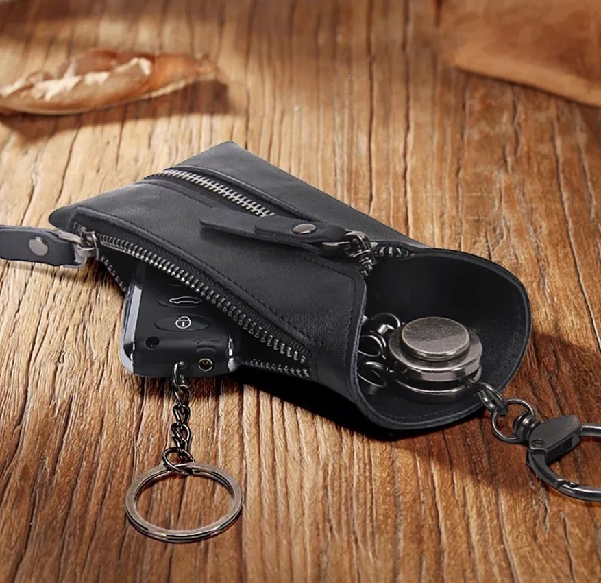 Этот футляр сделан из мягкой кожи и закрывается молние, ключи в нем не болтаются. Внутри предусмотрены металлические крепления, а сбоку есть карман, куда можно убрать автомобильный ключ или карту. Модель представлена в трех спокойных расцветках, так что легко подобрать вариант под ежедневное использование. Размеры 12 х 7 см.
