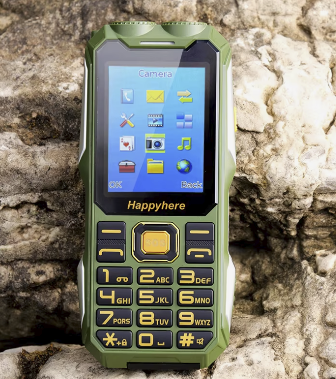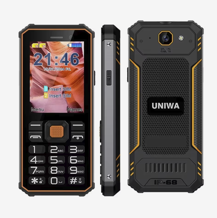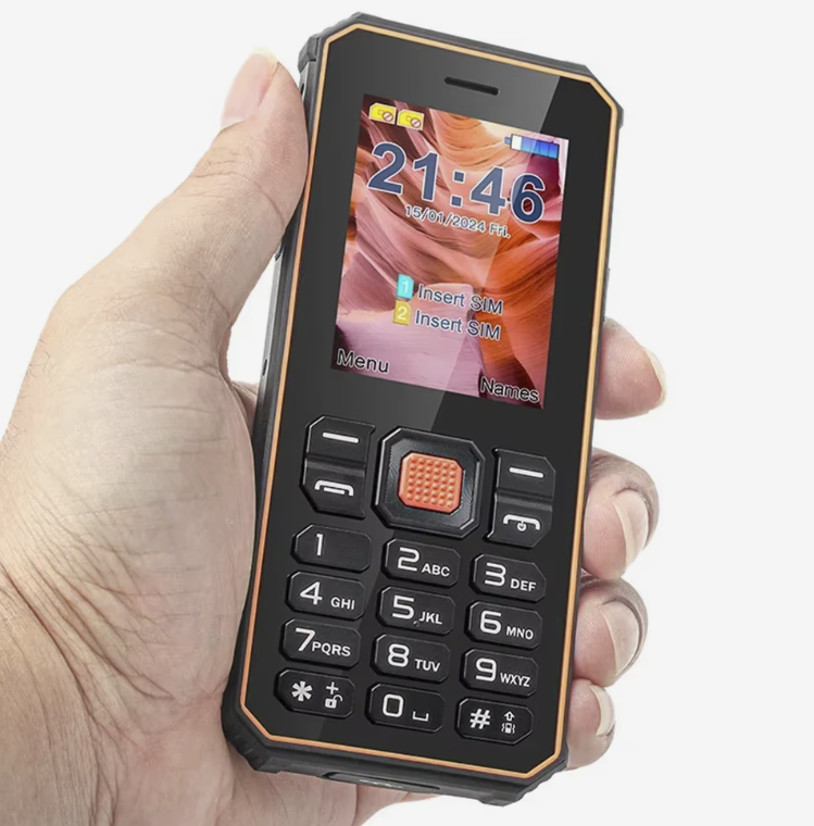 Это кнопочная модель с защищённым корпусом, без лишних функций. Телефон работает в 2G-сетях и поддерживает две SIM-карты. Формат классический кнопочный, с экраном 2.4 дюйма и простым интерфейсом без установки приложений.