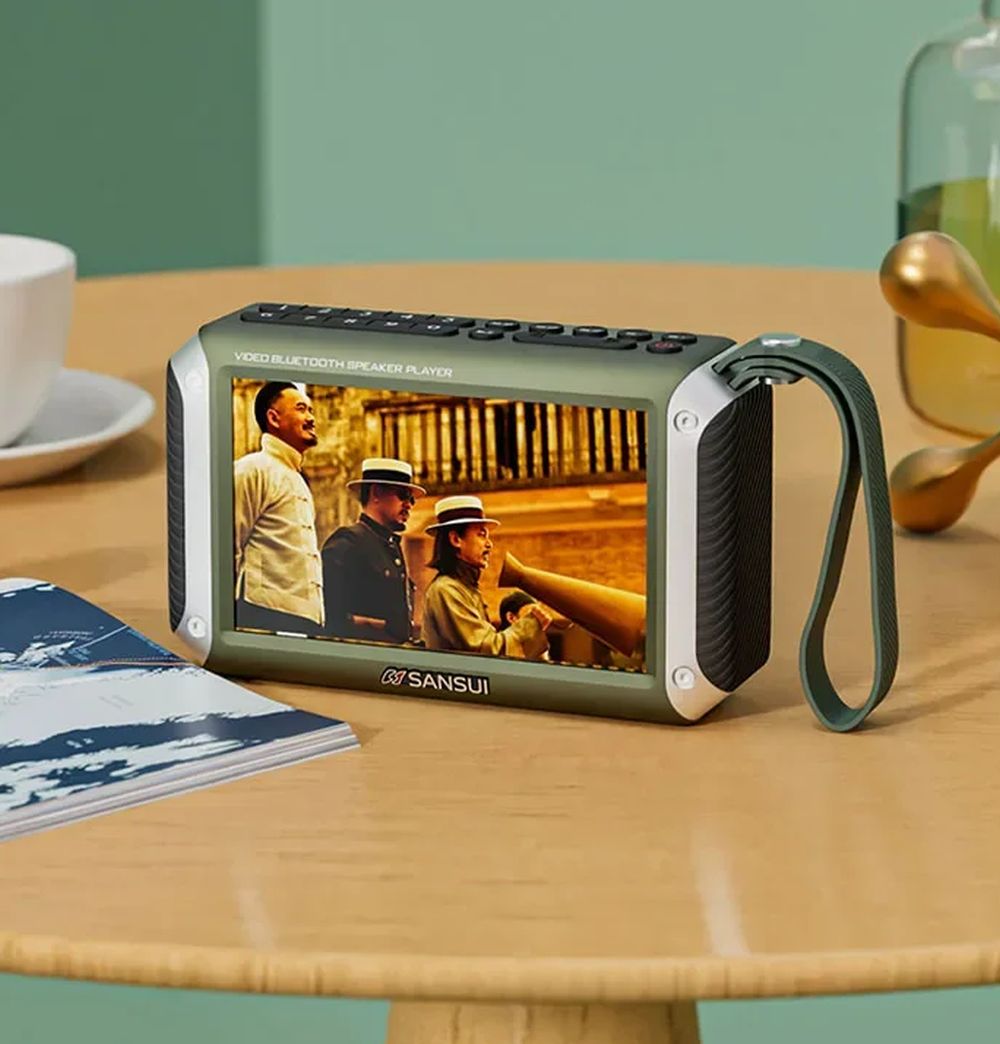 Оказываются бывают и такие. Портативная колонка оснащена десятидюймовым дисплеем. Поэтому помимо музыки (и FM-радио) устройство может воспроизводить видеоклипы и фильмы записанные на карту памяти или передаваемые через USB. На дисплее устройства отображается программная оболочка, а на верхней панели установлены кнопки закрытые силиконовыми накладками. На боковой стороне сделана удобная для переноски петля на руку. Динамик имеет мощность 8Вт. Емкость аккумулятора 3600мАч.