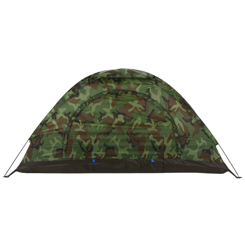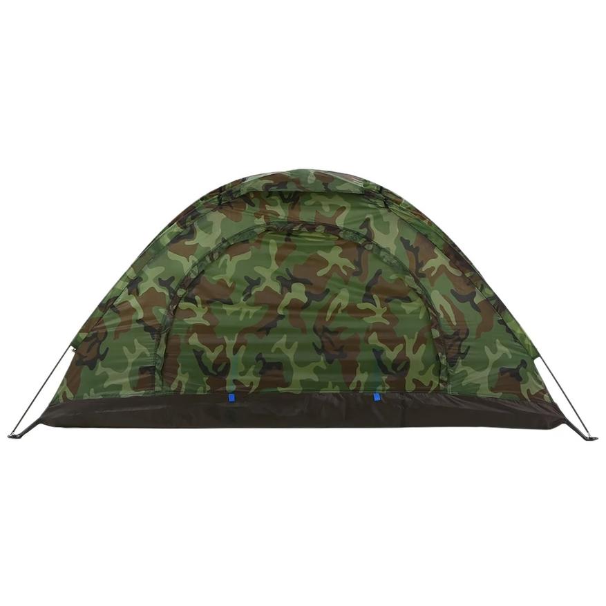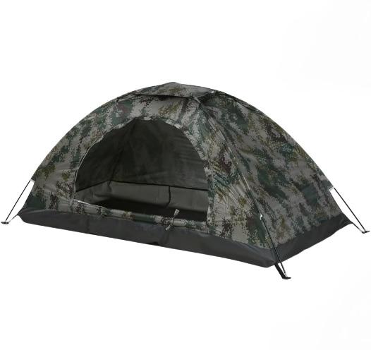 Продавец предлагает палатки в трех разных цветах (черный, камуфляжный и синий) на одного или двух человек.