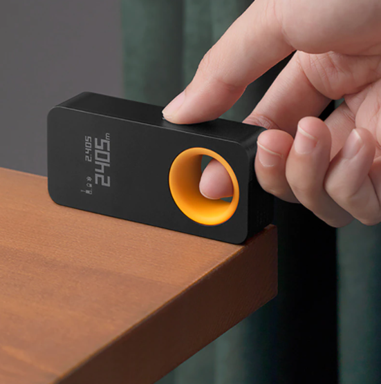 Следующее место в подборке занимает прочный дальномер, выполненный в интересном дизайне — в центре имеется сквозное кольцо с жёлтой отделкой. Кольцо сделано из резины, с его помощью удобнее фиксировать дальномер при измерении. Устройство имеет собственное приложение Mi-Home (подключается к смартфону через блютуз), таким образом, сохраняются данные, также в нём отображается план этажа вместе с реальными измерениями. Подключение к приложению моментальное, рекомендую убедиться, что связь налажена, чтобы снимки не пропали и сохранились в устройстве. Лазерная точность: ± 2 мм. Диапазон измерения — от 0,05 до 30 м. Лазер класса II. Литиевая батарея 200 мАч.