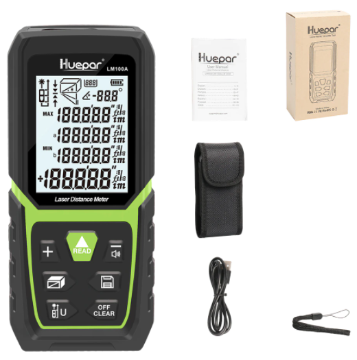 И завершает подборку лазерный дальномер, надёжный в измерении и очень простой в использовании. Производит измерения по теореме Пифагора. Рабочая температура от —20 до 65°C. Угол наклона: ±90 градусов. Тип лазера: от 620 до 680 мм. Точность лазера — ± 2 мм. Имеется подсветка и функция автоматического отключения. Питание осуществляется от трёх батареек (они в комплект не входят). Поставляется с инструкцией пользователя, шнурком для руки, USB-кабелем и портативным чехлом.