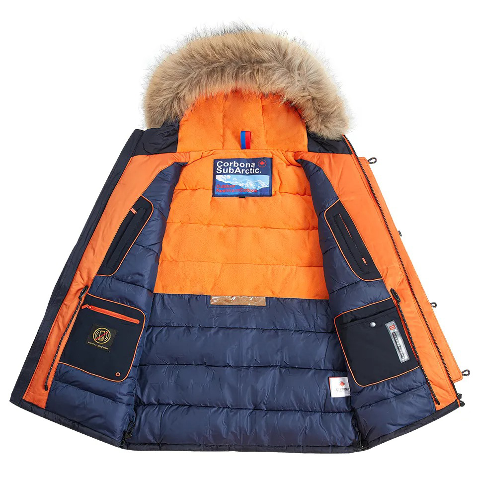 Снаружи куртка выполнена из водонепроницаемого толстого нейлона, внутри — толстый слой синтепона и оранжевая гладкая подкладка из полиэстера.