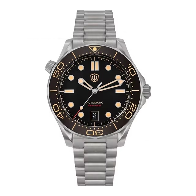 Часы работают на механизме PT5000 с автоподзаводом: это классический калибр на 25 камнях, который заводится при ношении (также доступен для заказа калибр NH35A/24 камня). Диаметр корпуса около 36 мм, толщина примерно 12 мм, за счет чего модель выглядит компактно на запястье. Водозащита заявлена на уровне 20 бар (примерно 200 метров), плюс есть завинчивающаяся заводная головка. Это стандартное решение для герметичности.