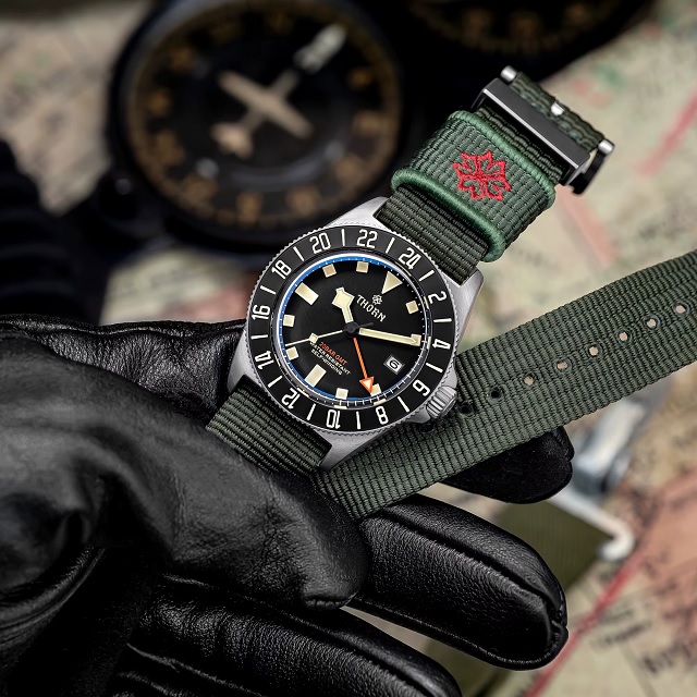 Безель здесь со школой на 24 часа и вращается в обе стороны — его используют вместе с GMT-стрелкой. Индексы на циферблате покрыты люминесцентным составом. Ремешок тканевый, со стандартной шириной 22 мм. Корпус выполнен в размере 42 мм.