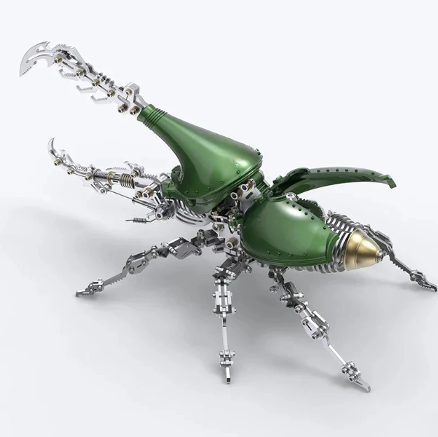 Это крупная модель жука-геркулеса в стиле стимпанк, созданна из высококачественной нержавеющей стали и межи. Благодаря гидравлическим суставам на лапах, базовой механической основе модели и открывающимся крыльям модель выглядит как фантастическое существо из альтернативной робо-вселенной.