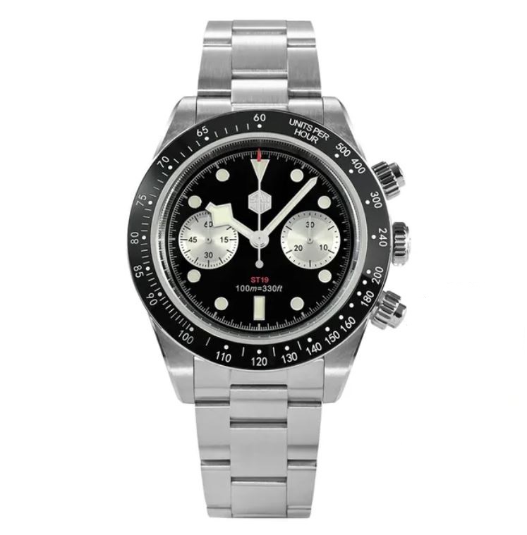 Эта модель часов от San Martin отлично сочетает традиции и инновации, а также высокое качество по приемлемой цене. Внутри скрыт механизм ST1902 от Seagull, который является клоном швейцарского Venus 175. Он обеспечивает точность хода, надежность и качество аксессуара. Корпус дополнен керамическим безелем, который придает часам более стильный и современный вид. Диаметр корпуса 40 мм, ширина браслета 20 мм. Заявленная водозащита 100 метров (10 бар). В таких часах можно спокойно плавать и попадать под сильный дождь, однако от погружения на глубину всё же лучше отказаться.