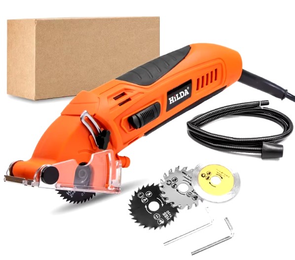 Для начала хочу предложить вашему вниманию пилу от известного китайского бренда Hilda. Эта модель работает с небольшими отрезными кругами с диаметром 55,4 мм, это очень важный момент, поскольку он определяет глубину реза инструмента, которая составляет немногим больше одного сантиметра. Поэтому, можно сказать, что данная пила предназначена для узконаправленных работ.
