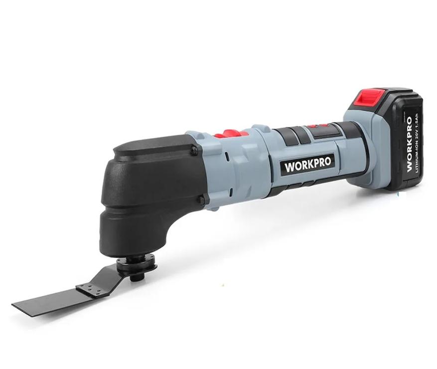 Еще одна модель реноватора от бренда WORKPRO, но теперь уже беспроводной вариант. В качестве элемента питания здесь используется литий-ионный аккумулятор 20 В 1.5 Ач. Компактные габаритные размеры, а также небольшой вес, позволят удобно работать инструментом даже в самых труднодоступных местах, не заботясь о наличии розетки поблизости. На корпусе реноватора расположены два управляющих элемента: кнопка включения/отключения, и регулятор скорости. Поставляется W004538A с фирменной брендовой сумкой, четырьмя насадками для работы с различными материалами, набором абразивных листов, шестигранным ключом для установки насадок, а также зарядным устройством.