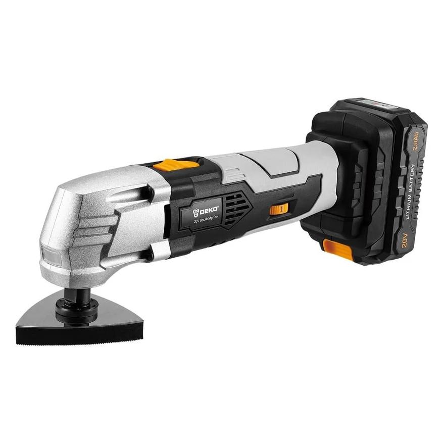 Следующая в подборке модель от известной китайской торговой марки DEKO. DKOT20 Multi — это компактный реноватор, хорошо подходящий для работы в труднодоступных местах. Устройство работает от аккумулятора на 20 В, который входит в комплект поставки. Беспроводной тип питания позволит работать в местах, где нет возможности подключить электроинструмент к сети, допустим, на улице. Рабочий диапазон частоты колебаний несколько выше, чем у предыдущего реноватора в подборке, и составляет 5000-19000 кол/мин. Здесь с уверенностью уже можно будет резать и шлифовать более твердые материалы, такие как кафельная плитка или металл. Регулировать частоту колебаний можно с помощью небольшого переключателя, расположенного на боковой стороне корпуса. В комплект поставки входит: реноватор с аккумулятором, зарядное устройство, шестигранный ключ, треугольная шлифовальная пластина с двумя наждачными листами разной зернистости, одно стандартное лезвие 32 мм, а также один скребок.