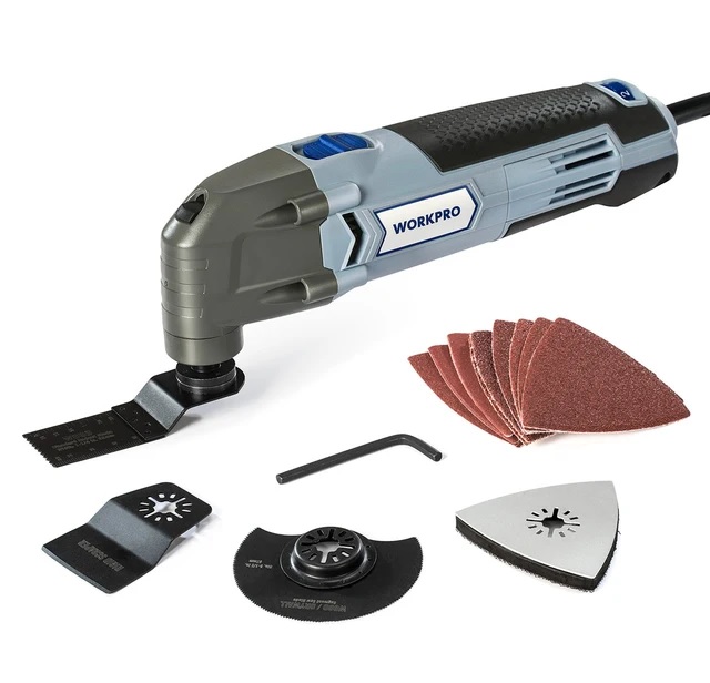 Данная модель от одного из ведущих китайских производителей ручного инструмента WORKPRO. W123005A — это компактный проводной реноватор мощностью 300 Вт, работающий в диапазоне 10000-23000 кол/мин. По своим функциональным возможностям не уступает более дорогим моделям именитых брендов. Корпус выполнен из прочного пластика, с прорезиненной вставкой для более цепкого хвата рукой. Есть кнопка включения с плавным пуском, а также шестиступенчатый переключатель скорости. Поставляется в фирменной сумке с режущим полотном и скребком, полукруглой насадкой, шлифовальной подошвой, наждачными полотнами, и шестигранным ключом.