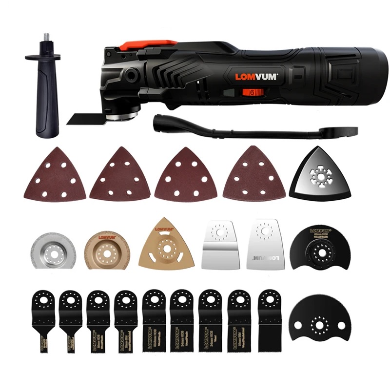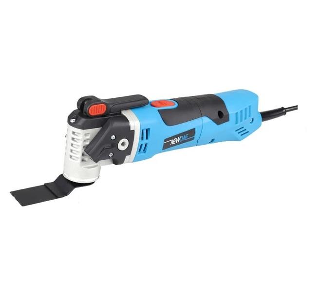 Мощный универсальный реноватор с предельной мощностью до 500 Вт. Питание электроинструмента осуществляется от сети 220 В. Корпус выполнен из черного матового пластика. Над кнопкой включения расположен быстросменный фиксатор для крепления насадок. Частота колебаний оснастки регулируется шестиступенчатым переключателем в пределах 15000-22000 кол/мин. Данный осциллятор справится с большинством деликатных работ связанные с пилением, резкой, и шлифовкой. Дополнительно хотелось бы отметить большой угол колебания оснастки, составляющий 5 градусов. В подавляющем большинстве подобных реноваторов, этот параметр составляет около трех градусов. Комплектуется инструмент удобной боковой ручкой, трубкой для подключения к пылесосу, а также набором стандартных насадок для пиления и шлифования.