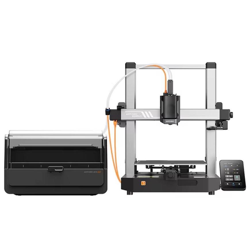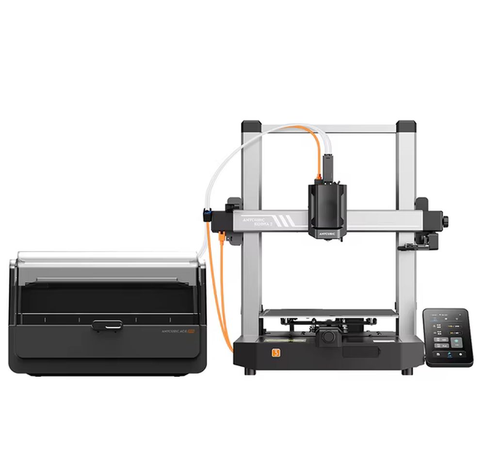 Компания ANYCUBIC еще один известный бренд в сфере производства 3D принтеров. Достаточно свежая модель Kobra 3 может похвастаться возможностью цветной печати, попеременно используя пластиковые разного цвета с возможностью печати (от четырех до восьми цветов). Переход с одного цвета на другой переходит автоматически, согласно данным из файла печати. Для этих целей в комплекте идет специальный бокс в который помещаются катушки разного пластика (с дополнительной функцией его сушки). Область печати: 250x250x260мм, открытая рамная конструкция. Максимальная скорость до 600мм/с. Встроенный сенсор определения и компенсации вибрации, для более четкой и гладкой печати. Усиленная рама.