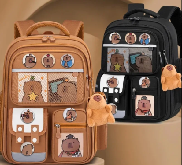 Детский рюкзак с изображением капибары выполнен из прочного водоотталкивающего материала (ткань Oxford). Подходит для школьников и рассчитан на повседневное использование. Цвет однотонный, без ярких принтов. В комплект входят декоративные элементы — значки, карты и брелоки, как указано на изображении. Модель имеет ортопедическую спинку. Спинка плотная, с мягкими вставками. Рюкзак имеет вместительный основной отсек и дополнительные карманы. Размер рюкзака — большой, подходит для школьников начальной и средней школы. Изготовлен в Китае.