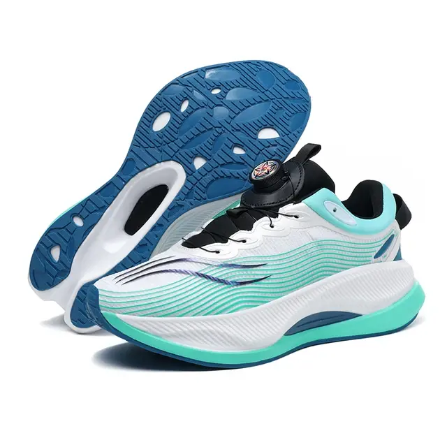 Кроссовки выполнены в бело-сине-мятной цветовой гамме, имеют низкий профиль и волнообразный дизайн верхней части. Оснащены системой быстрой фиксации с поворотным механизмом на язычке. Подошва состоит из нескольких слоёв: белый промежуточный слой с анатомической формой, мятная вставка у основания и синяя резиновая подмётка с рельефным рисунком и сквозными отверстиями для гибкости. В конструкции сочетаются синтетические материалы и текстильные элементы, предусмотрена петля на пятке для удобства надевания. Модель предназначена для спортивных и повседневных активностей.