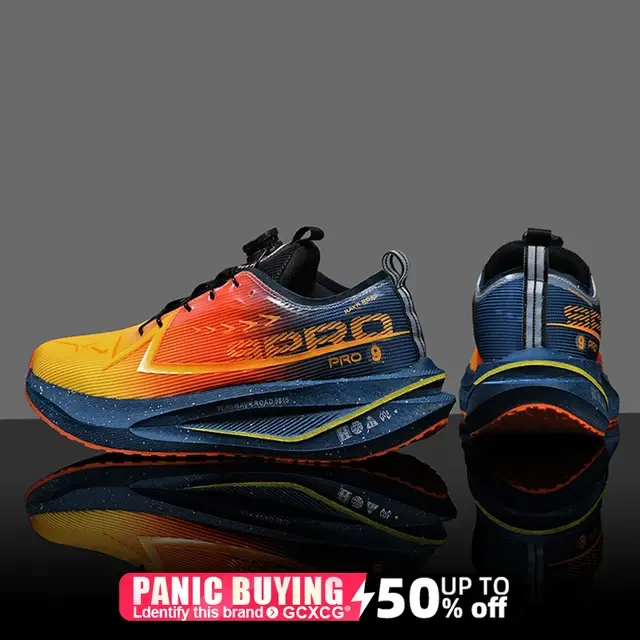 Кроссовки выполнены в ярком градиентном дизайне с переходом от жёлтого к оранжевому и тёмно-синему цвету, оснащены классической шнуровкой с чёрными шнурками. На боковой части размещена крупная надпись «320 PRO 9» оранжевого цвета. Подошва многослойная: промежуточный слой тёмно-синий с жёлтыми акцентами, внешний слой — с оранжевыми элементами. Конструкция включает петлю на пятке для удобства надевания, а также усиленные элементы в области носка и пятки. Верхняя часть сочетает синтетические материалы с текстурированной поверхностью, подошва выполнена с рельефным рисунком для улучшенного сцепления.