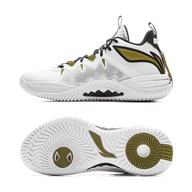 Баскетбольные кроссовки Li-Ning выполнены в бело-зелено-чёрной цветовой гамме, имеют сетчатый верх для улучшенной вентиляции. Конструкция предусматривает классическую шнуровку и петли на пятке для удобства надевания. Подошва обладает сложным рельефным рисунком с двумя крупными круглыми зонами сцепления оливкового цвета — одна в области пятки, другая в передней части стопы. Промежуточная подошва массивная, с волнообразными элементами для амортизации. Боковая часть украшена фирменным логотипом Li-Ning в виде стилизованной волны, выполненным в оливковом цвете с чёрной окантовкой. Дизайн сочетает функциональные элементы для поддержки стопы и динамичные визуальные акценты.