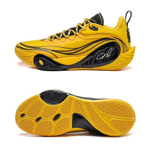 Кроссовки выполнены в ярко-жёлто-чёрной цветовой гамме, имеют низкий профиль и динамичный дизайн с волнообразными чёрными линиями на жёлтом фоне. Оснащены классической шнуровкой с жёлтыми шнурками, петлёй на пятке для удобства надевания и усиленной вставкой в области пятки. Промежуточная подошва массивная, с чёрным глянцевым элементом, на котором нанесена подпись-логотип. Внешняя подошва жёлтая, с рельефным рисунком и сегментированной структурой для улучшенного сцепления. Верхняя часть сочетает синтетические материалы, подошва выполнена из резины.