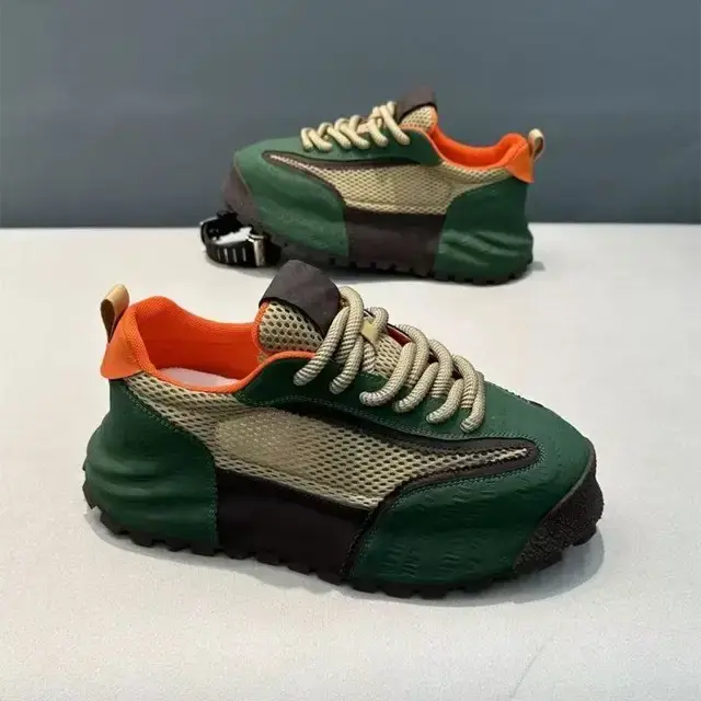 Кроссовки выполнены в комбинированном дизайне с использованием зелёного, бежевого, коричневого и оранжевого цветов: основная часть верха — зелёная с текстурированной поверхностью, боковые вставки — из бежевой сетчатой ткани, внутренняя подкладка — оранжевая, промежуточная подошва — тёмно-коричневая. Оснащены классической шнуровкой с бежевыми шнурками, имеют петли на пятке для удобства надевания. Подошва массивная, с выраженным протектором, выполнена в тёмно-коричневом цвете. Конструкция сочетает элементы из сетчатого материала и плотных вставок для поддержки стопы.