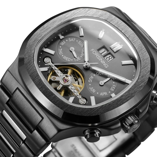 Прочное минеральное стекло устойчиво к появлению царапин, а уровень водонепроницаемости 3 бара обеспечивает базовую защиту от влаги. Скелетонизированный циферблат открывает вид на механизм турбийона, а люминесцентные стрелки и метки позволяют легко считывать время в условиях недостаточной освещённости. Часы оснащены полным набором календарных функций: дата отображается в отдельном окне, день недели — на вспомогательном циферблате в верхней части, месяц — на вспомогательном циферблате в нижней части. Автоматический механизм с автоподзаводом работает от движения руки владельца и не требует замены батареек.