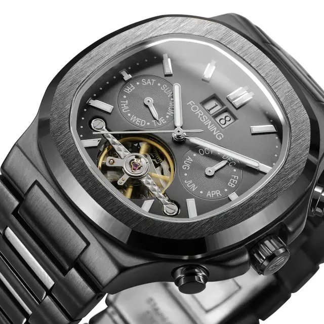 Модель часов Forsining выделяется восьмиугольным корпусом диаметром 40 мм. Корпус изготовлен из металлического сплава и имеет сатинированную (матовую) отделку, его толщина составляет 14,5 мм. Общая длина изделия — 220 мм, а вес — 159 граммов. Браслет и застёжка выполнены из нержавеющей стали, ширина браслета варьируется в пределах 25/17 мм.