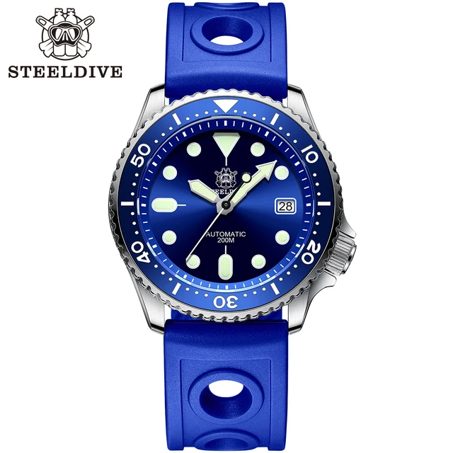 Часы Steeldive выполнены в классическом стиле дайверских моделей. Модель имеет корпус из нержавеющей стали. Её отличительная черта — вращающийся безель с минутной шкалой (до 50 делений), предназначенный для учёта времени погружения. Глубокий синий циферблат дополнен крупными люминесцентными метками и стрелками — благодаря им время хорошо считывается даже в условиях недостаточной освещённости. На позиции «3 часа» предусмотрено окошко с отображением даты.