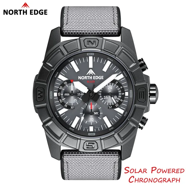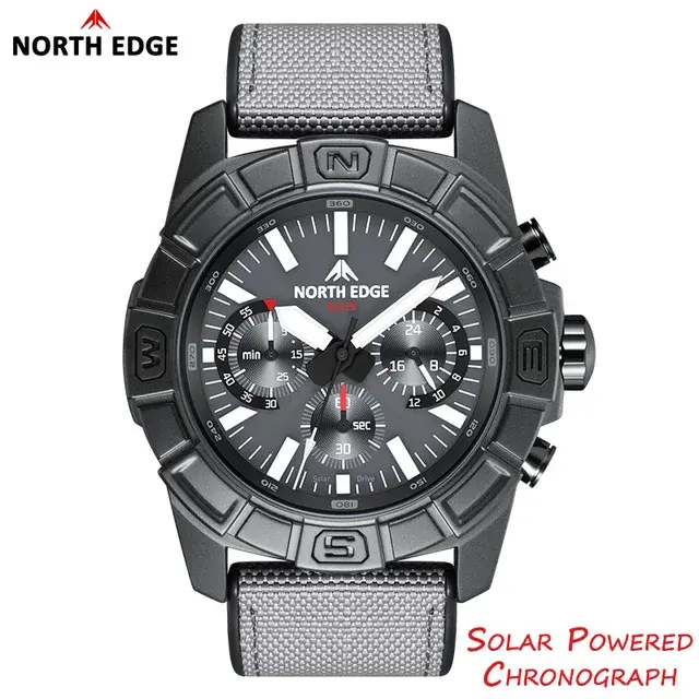 Механизм часов работает на солнечной энергии (Solar Powered), что обеспечивает автономную работу без замены батареи. На циферблате присутствует логотип бренда North Edge и надпись «Solar Powered Chronograph». Кнопки управления хронографом и заводная головка расположены на правой стороне корпуса.