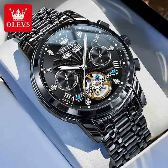 Часы OLEVS выполнены в классическом мужском дизайне с корпусом и браслетом из полированного металла чёрного цвета. Корпус имеет округлую форму с чётко выраженными гранями, браслет состоит из крупных звеньев. На циферблате присутствует логотип бренда OLEVS, а также изображение короны над названием марки.