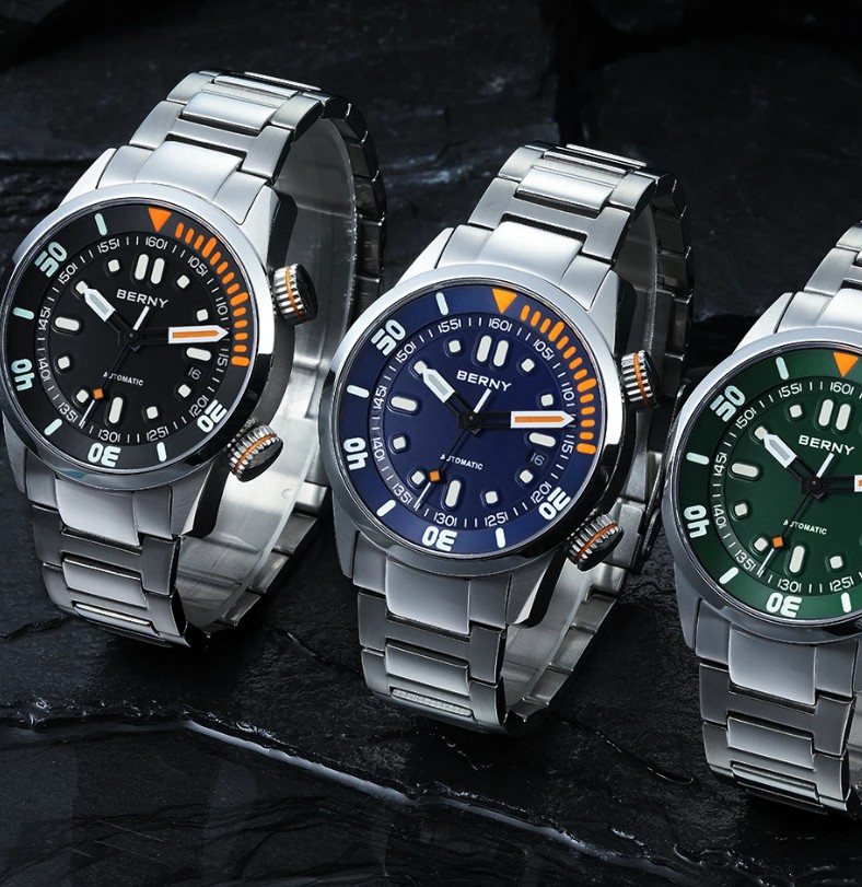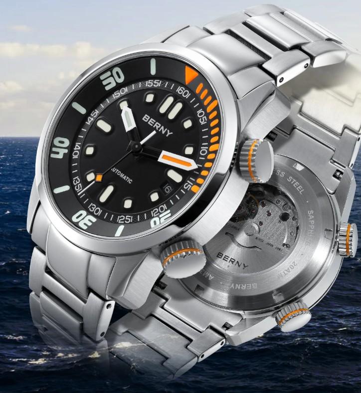 Berny AM339M — это автоматические часы с ярко выраженным дайверским характером, но в современной реализации. Однако важно отметить, что часы не имеют классического безеля. Сердцем модели является известный механизм Miyota 8215 с автоподзаводом, который работает за счёт движения руки владельца и не требует батарейки (разумеется, часы время от времени нужно заводить вручную, как и другие модели в подборке). Стальной корпус хорошо защищён от внешних воздействий и дополнен массивным металлическим браслетом.
