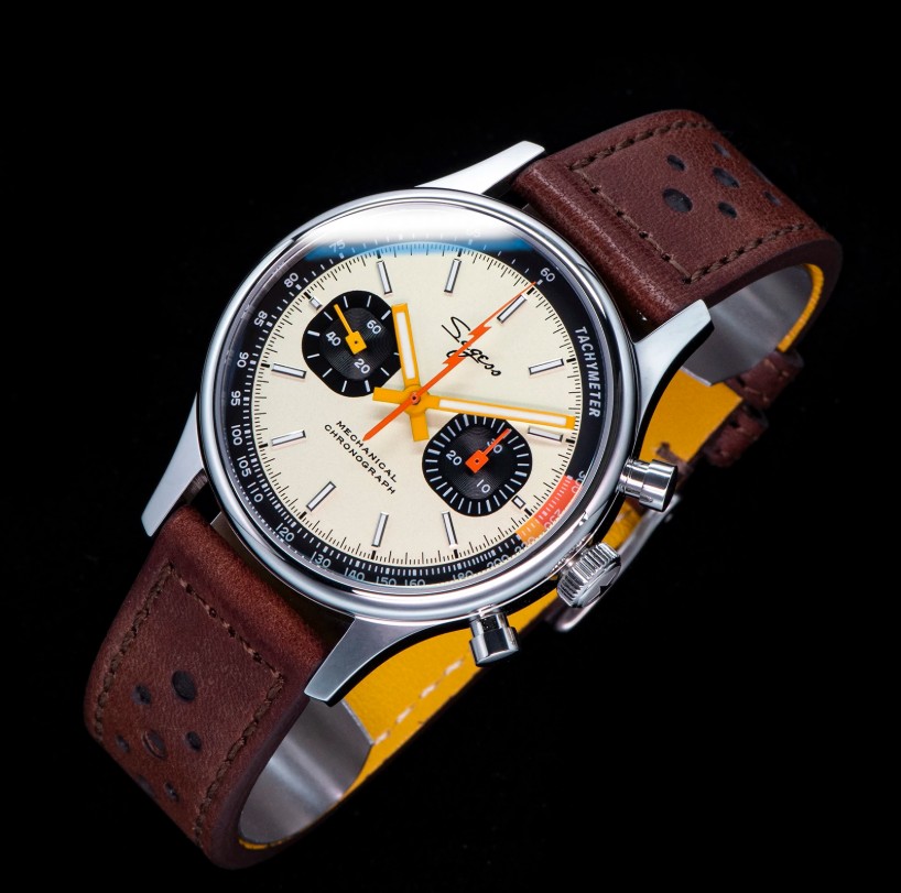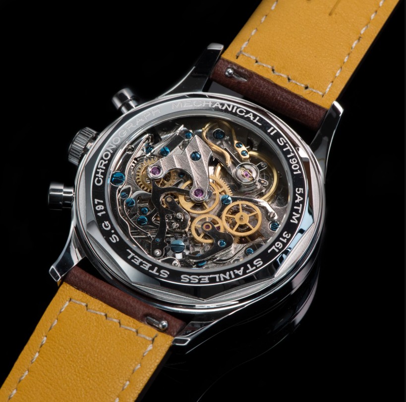 Это стильные механические часы в одновременно винтажном и гоночном стилях, сочетающие классическую эстетику и современную механику. Модель оснащена механическим хронографом с ручным заводом на базе калибра ST1901, который позволяет измерять короткие промежутки времени с помощью центральной секундной стрелки и дополнительных субциферблатов.