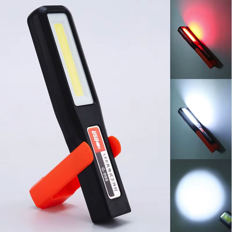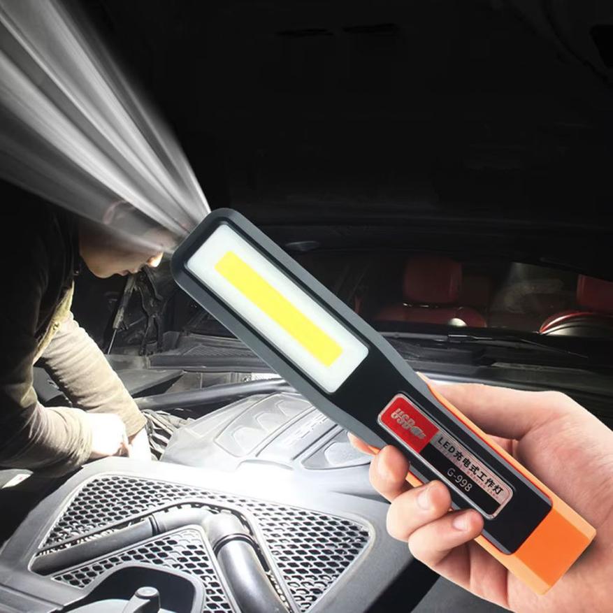 Отличный фонарик для подсветки рабочего помещения. В конструкции с одной стороны установлен яркий точечный XPE-элемент освещения, а на боковой стороне — широкая COB-матрица. Раскладная рукоятка (с поворотом на 270 градусов) позволяет установить осветительный прибор на горизонтальную поверхность под углом, а магнит и крючок дают возможность зафиксировать на капоте автомобиля или подвесить над местом проведения работ.