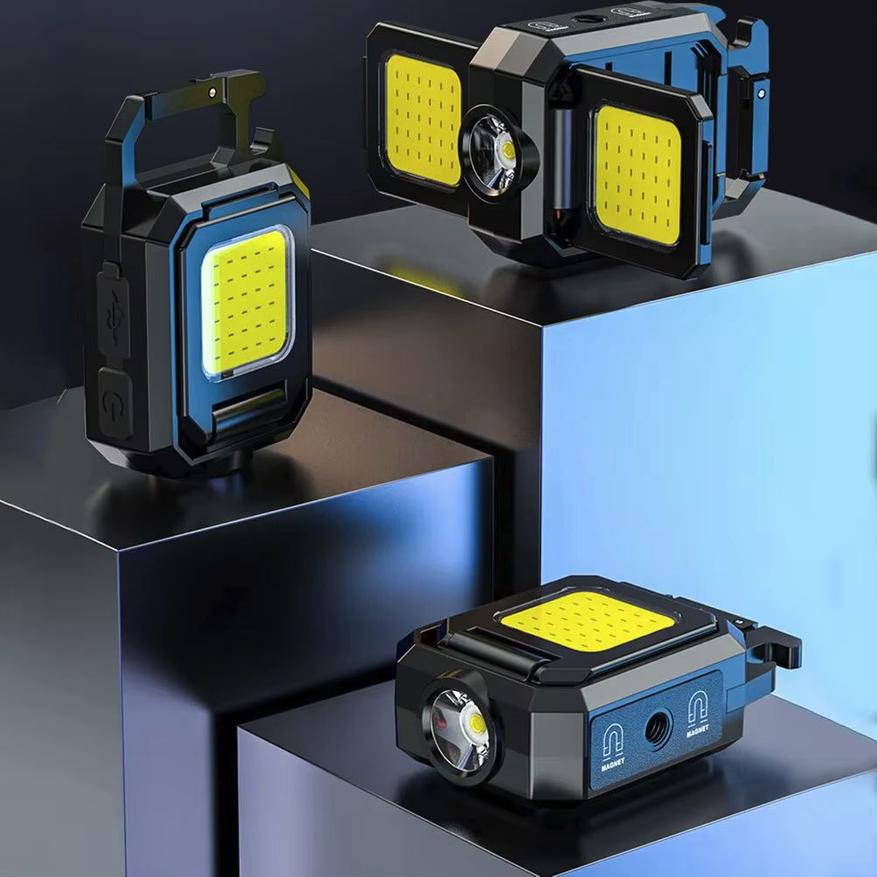 Еще одна необычная модель компактного фонарика с несколькими световыми элементами и магнитным основанием. С одной торцевой стороны находится карабин для подвески и открывашка, с противоположной линза с XPE-светодиодом, а вот по бокам расположены квадратные COB-модули способные раскладываться на угол до 90 градусов. Включать можно каждый световой компонент независимо друг от друга или все вместе. Заявленная max яркость до 1000LM.