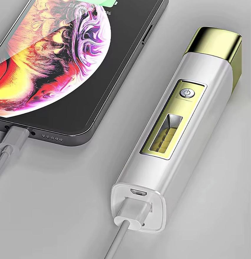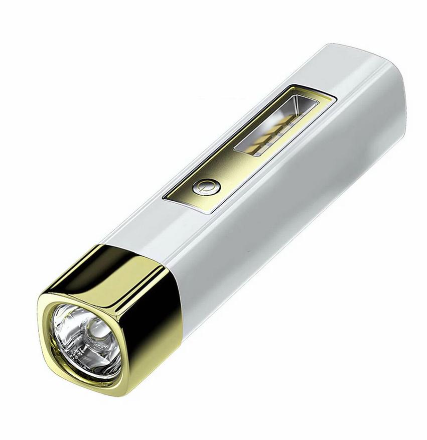 Фонарик не обязательно должен быть черного цвета. Данная модель оснащенная емким аккумулятором на 1200мАч выполнена в бело-золотистом стильном корпусе и может обеспечить питанием как себя, так и любой другой девайс поблизости, работая в качестве пауэбанка. Центральный торцевой светодиод дает яркий свет на дистанцию 200м, а полоса светодиодов сбоку — для подсветки рабочей зоны.