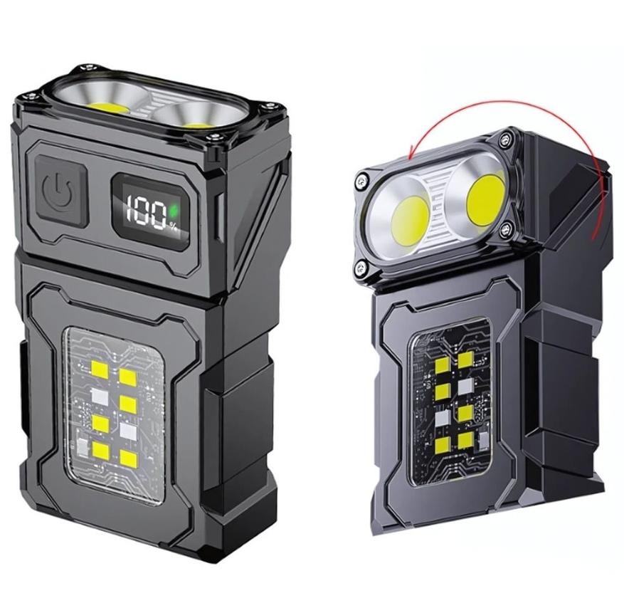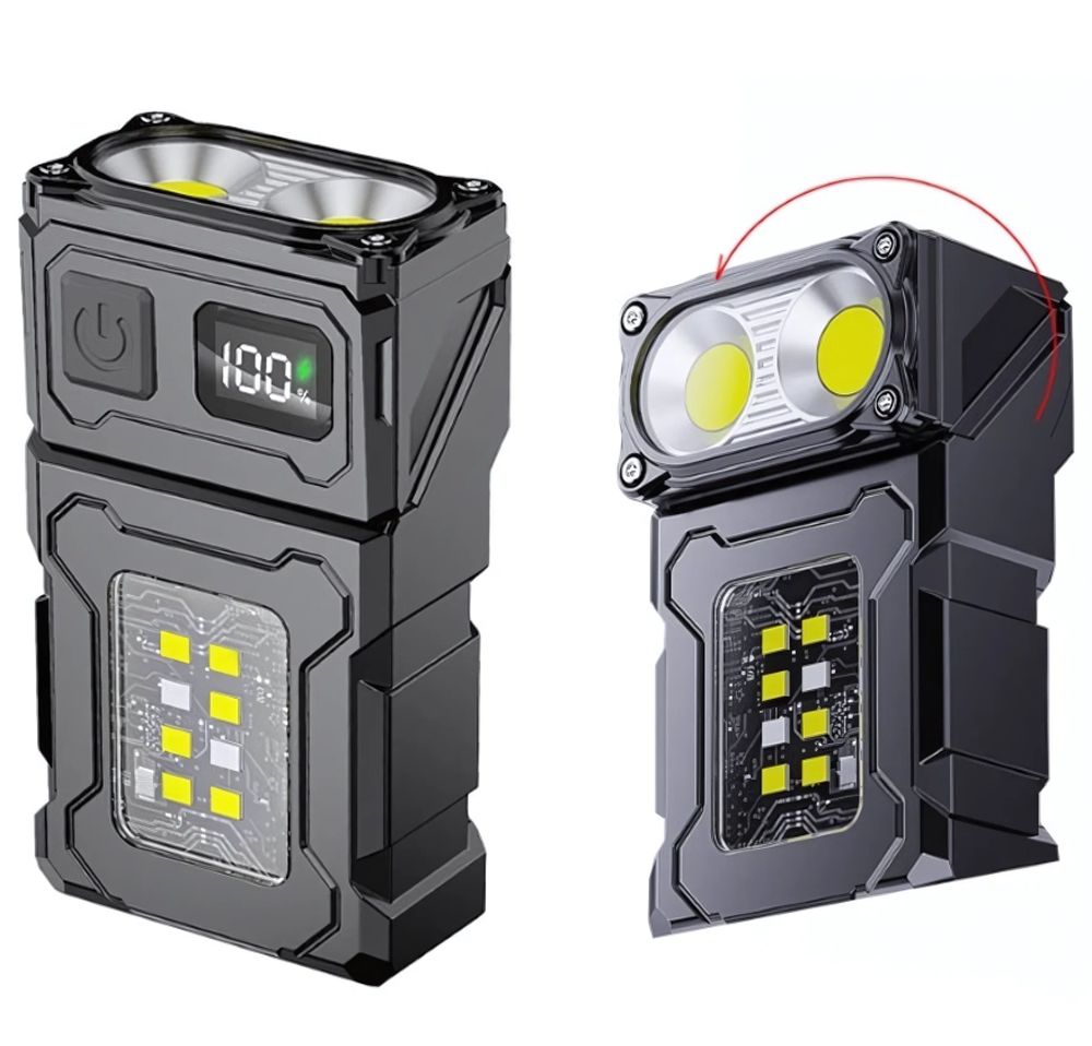 Модифицируемый двойной фонарь с поворотной верхней частью, которая расширяет способы использования данного фонарика в работе и походах. На узкой части XPG светодиод, сбоку — COB матрица. Оснащен магнитом на торце с вращающимся наклонным основанием. Батарейный блок: 2000mAh, пять режимов освещения. Алюминиевый сплав корпуса. Может светить былым и красным светом. Подойдет и в качестве налобника с резиновой лентой из комплекта.