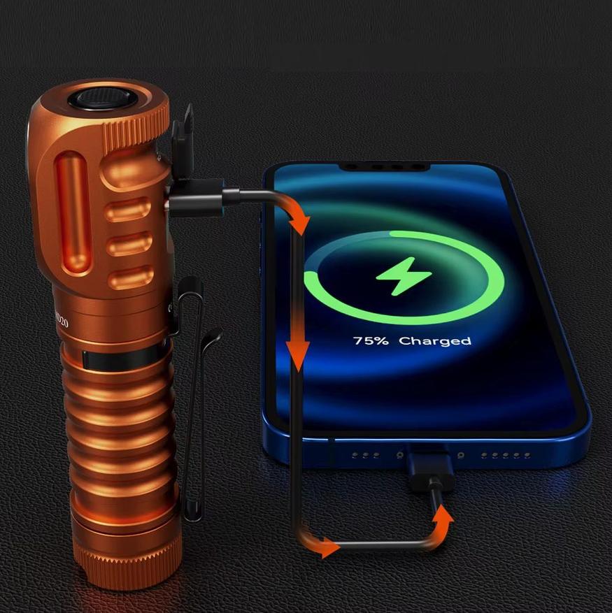 В данном фонарике производитель Wurkkos реализовал интересное решение совместив рядом на боковой стороне два ярких светодиода, но с различным назначением. Первый LED XP-L HD выдает широкий угол освещения, а вот второй светодиод LH351В предназначен для точечного освещения небольших участков. Аккумулятор 21700 формата может зарядиться до 5000мАч, что позволяет использовать фонарь в качестве пауэрбанка. Комплектная мягкая резиновая лента с креплением, дает позволяет HD20 использовать как налобный вариант фонаря. Регулируемая яркость 35-2000 люмен.